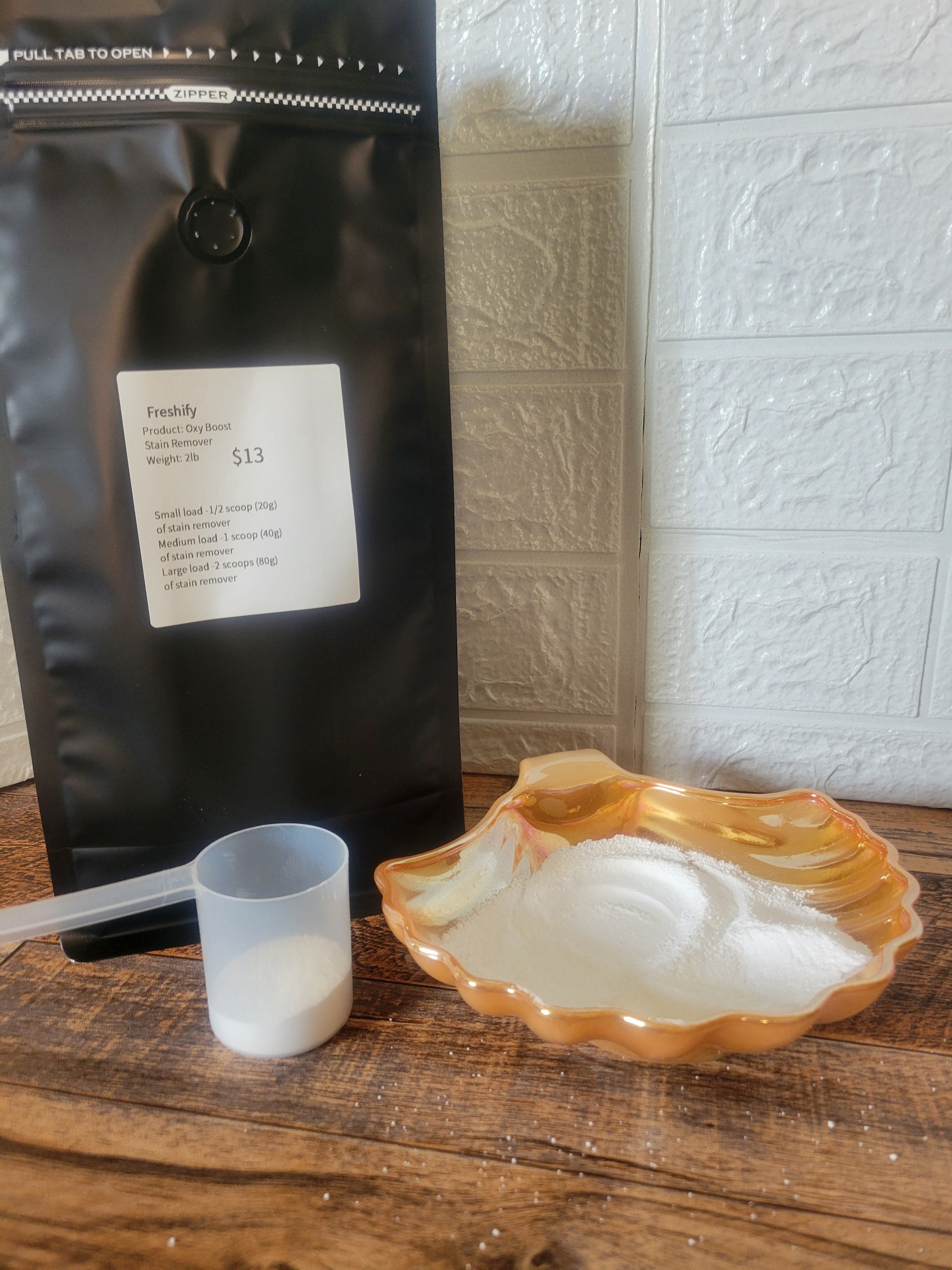 Oxy Boost Stain Remover; made with two simple minerals. HE safe